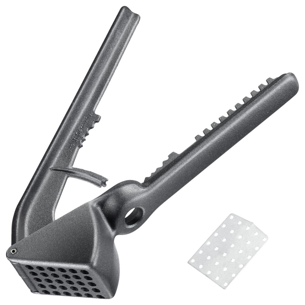 Westmark multi-purpose press Extracta - Black Edition The Westmark Extracta - Black Edition is much more than a classic garlic or onion press. It has been developed for multifunctional use in the professional kitchen - robust, ergonomic and versatile. The appliance processes onions and garlic effortlessly and is particularly efficient thanks to the insert sieve. The Extracta also has integrated functional elements on the handle for use as an olive destoner, nutcracker or fish scaler. Made from solid aluminium with a special non-slip coating, the press sits comfortably and securely in the hand - even when used for long periods under time pressure. Advantages at a glance: For garlic & onions - with removable sieve for easy cleaning Multifunctional: Integrated tools for olives, nuts & fish Ergonomic design with extra non-slip feel Robust aluminium design with special coating - durable & easy to clean Suitable for dishwasher Made in Germany - quality for the catering trade Colour: black / silver