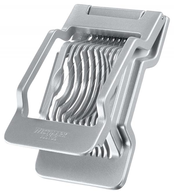 Visokokvalitetna mašina za sečenje jaja od livenog aluminijuma. Pojedinačno zategnute žice od nerđajućeg čelika za brzo i čisto rezanje tvrdo kuvanih jaja. Okruglog ili ovalnog oblika. Lako se drži zahvaljujući zakrivljenoj ručki.