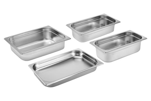 Četverodijelni GN kontejnerski set koji se sastoji od 2x GN 1/2 (32,5 x 26,5 cm) i 2x GN 1/3 (32,5 x 17).6 cm), svaki sa različitom dubinom: * 1x GN 1/2, 4 cm dubine (2,4 l) * 1x GN 1/2, 6,5 cm dubine (3,9 l) * 1x GN 1/3, 6,5 cm dubine (2,4 l) * 1x GN 1/3, 10 cm dubine (3,6 l) GN kontejneri napravljeni od hrom-nikla 18/18. Sa debljinom materijala od 0,8 mm robusna i izdržljiva.