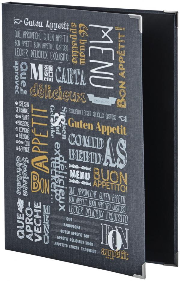 Rasklopivi meni sa platnenim omotima i atraktivnim vintage printom. Kutije za umetanje mogu se naručiti zasebno. Opremljen zavrtnjima za knjige sa unutrašnje strane.