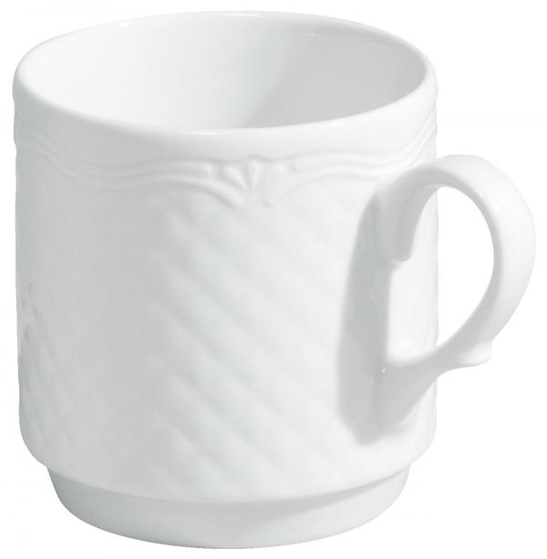 Bijela porculanska šolja. Sa klasičnim elegantnim reljefom. Može se prati u mašini za suđe i može se koristiti u mikrotalasnoj pećnici.