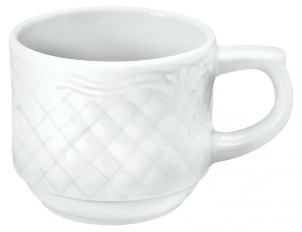 Bijela porculanska šolja za espresso. Sa klasičnim elegantnim reljefom. Može se prati u mašini za suđe i može se koristiti u mikrotalasnoj pećnic