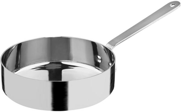 Okrugli mini tiganj napravljen od nerđajućeg čelika. Idealno za pripremu ili zagrevanje malih jela, kao i za stilsku prezentaciju vaših obroka. Nije pogodno za mikrotalasne. Materijal: 18/0 nerđajući hrom-nikl čelik. Može se prati u mašini za suđe
