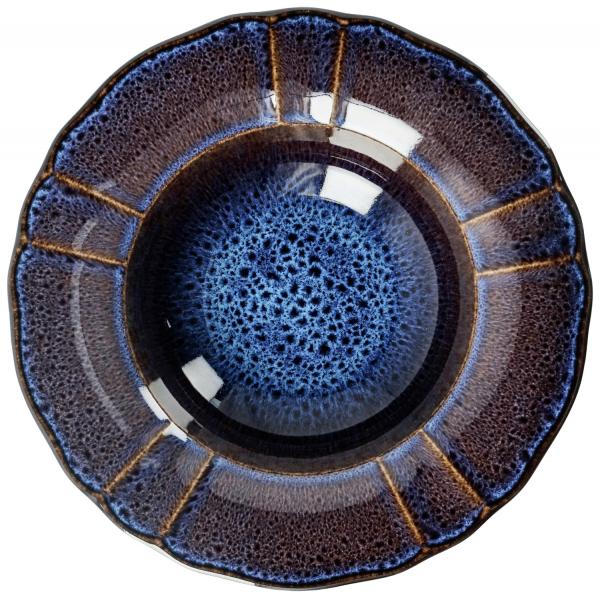 Šarena porcelanska ploča okruglog oblika. Diskretni reljef i razigrani ukrasni rubovi daju nostalgičnu notu. Jedinstven zahvaljujući reaktivnoj glazuri. Svaki komad je jedinstven. Boje mogu varirati od svetle do tamne. Može se prati u mašini za sudove i može se koristiti u mikrotalasnoj pećnici.