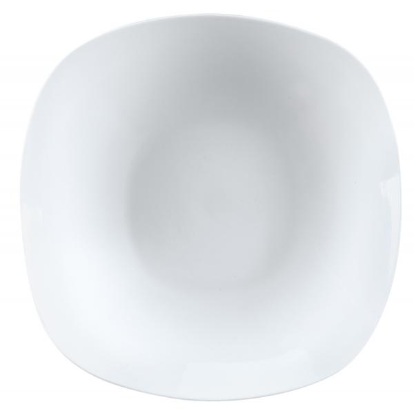 Moderni bijeli tanjiri od čvrstog hotelskog porcelana. U kvadratnom zaobljenom obliku. Bez ruba Može se prati u mašini za suđe i može se koristiti u mikrotalasnoj pećnici.