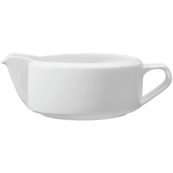 Bijela porcelanska posuda za sos u ovalnom obliku. Dostupan odgovarajući tanjir za posudu za sos. Može se prati u mašini za suđe i može se koristiti u mikrotalasnoj pećnici.