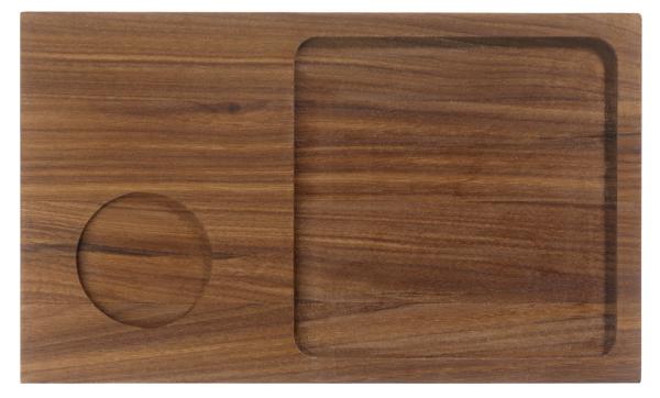 Uz kombinaciju pravog drveta, porcelana i škriljevca, uvijek ste u trendu: poslužite gostima fine detalje na visokokvalitetnim tanjirima od punog, nauljenog oraha ili hrasta. U okrugli profil (├y 5,4 cm) savršeno se uklapaju šolje kao i eksponati serija SINERGIE, CONTRAST i SAMOS. U kvadratni profil možete umetnuti tanjir od prirodnog škriljevca i savršeno predstaviti svoju hranu. Rešetkasti tanjir treba s vremena na vrijeme ispolirati maslinovim uljem, kako bi zadržao plemeniti sjaj. Drvo: nauljeno, nije pogodno za pranje u mašini za suđe! Uputstva za negu su uključena!
