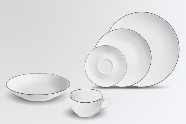 Set se sastoji od četiri šoljice za kafu 0,22 l, tanjira za šolju za kafu Ø 15 cm, tanjira ravnih Ø 21 cm i 27 cm i tanjira dubokih Ø 20 cm svaki. Bijelo posuđe sa ukrasnim crnim rubom.