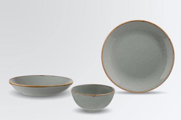 Set se sastoji od četiri ravnih tanjira Ø 24 cm, tanjira dubokih Ø 21 cm i činija ØkH 13k6,4 cm (0,4 l) svaki.