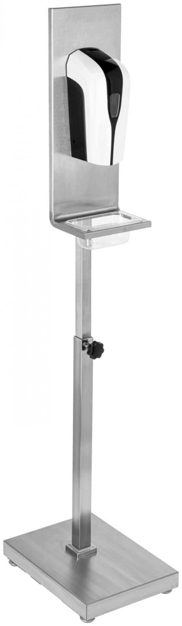 Dezinfekcioni štand za ulazni prostor, koji se sastoji od podnog štanda sa beskontaktnim dezinfekcionim dispanzerom. Dispenzer senzora za beskontaktnu dezinfekciju i jednostavno punjenje komercijalnih dezinfekcionih sredstava (molimo naručite zasebno). Dizajniran za 20.000 punjenja spreja po punjenju baterije (8x AA, baterije nisu uključene), približno 2.500 punjenja spreja po 1 l dezinfekcionom sredstvu. Kapacitet 1 l. Štand je izrađen od visokokvalitetnog hrom-nikal nehrđajućeg čelika 18/10. Visina podesiva od 1,2 m do 1,6 m. Uključuje praktičnu ladicu za kapanje kao zaštitu od kapanja. Dispenzer za dezinfekciju može se lako pričvrstiti na njega. Approx. dimensions WxHxD: Sensor dispenser 12.5x28x12 cm, stand 40x160x30 cm.