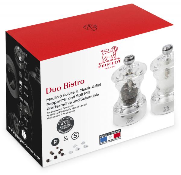 Model Peugeot BISTRO baziran je na originalnom dizajnu prvog Peugeot mlina iz 1874. godine, kultnog i bezvremenskog dizajna. Ovaj model je sada dostupan i u neosjetljivom akrilu. Novi materijal nudi suvremeni izgled Bistro seriji, a njegova transparentnost vam omogućava da na prvi pogled vidite da li se radi o mlinu za biber ili mlinu za sol. Veličina 10 cm čini mlin idealnim za upotrebu na stolu i nudi savršenu ergonomiju.