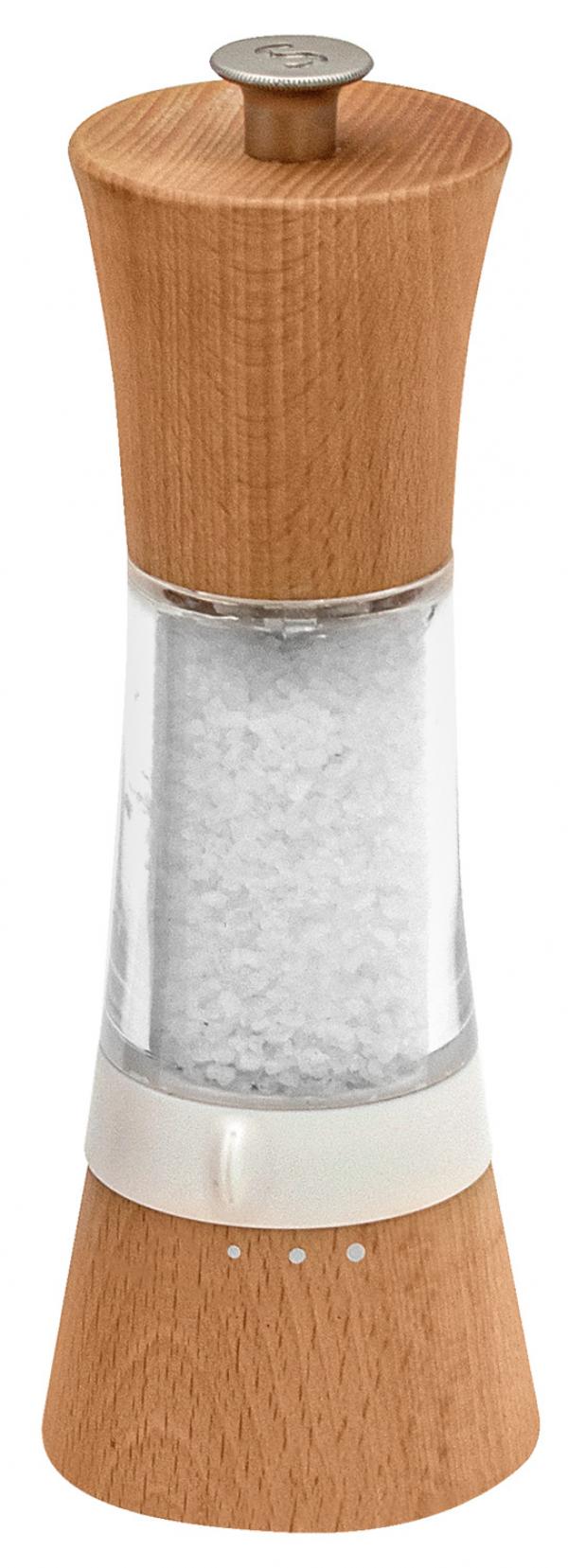 Mlin za so napravljen od lakiranog bukovog drveta i akrila. Ima ultra lagan i izdržljiv keramički mlin. Podešavanje mlevenja može se lako podesiti u tri faze pomoću mehanizma rotacije označene bojom.