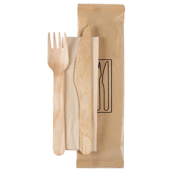 Održivi set noža, viljuške i salvete za jednokratnu upotrebu. Napravljen od FSC® sertifikovanog biorazgradivog brezovog drveta.
