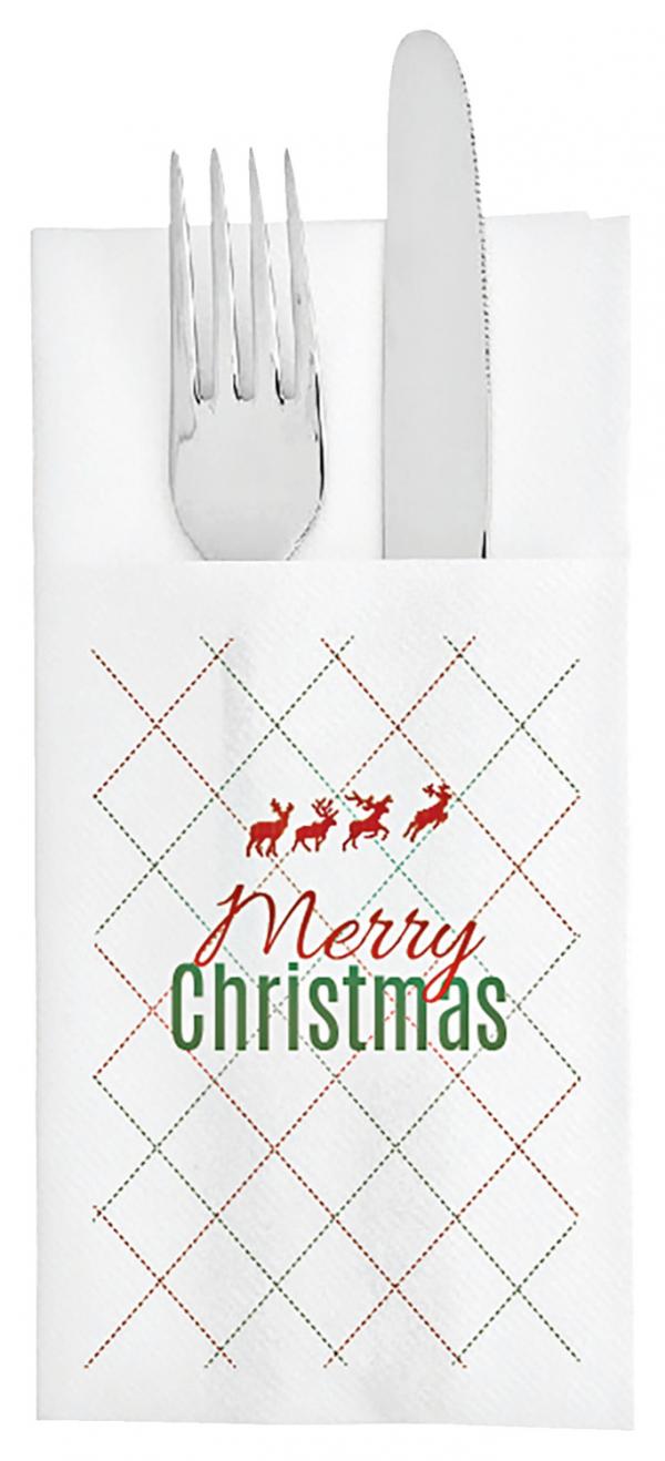 Visokokvalitetne vrećice za pribor za jelo od materijala nalik tkanini. Božićni dizajn.40k40 cm rasklopljen. Materijal: Vazdušno položen papir (55 g/m²)