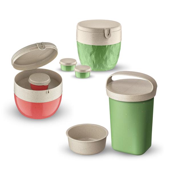 Set uzoraka sadrži posude za višekratnu upotrebu BentoBox (1x M i 1x L) plus lonac za užinu Buddy.