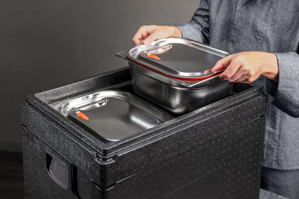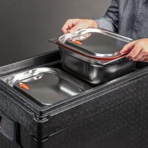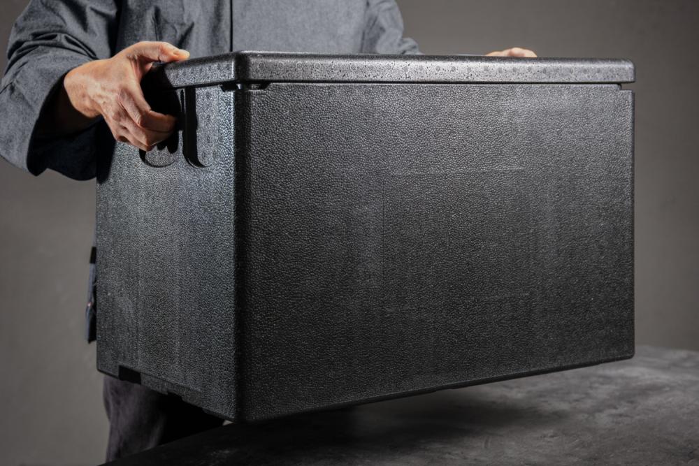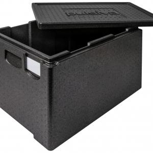 Robust and durable insulated box with fixed lid made of black EPP plastic (material thickness: 3 cm). Suitable for transporting, insulating, cooling and keeping food warm. With smooth, watertight inner surface. The insulating properties range from - 40 °C to + 120 °C, maximum temperature loss when the box is closed is 2-3 °C per hour. Particularly unbreakable, hygienic, food-safe and lightweight. Environmentally friendly, as 100% recyclable and CFC-free. Stackable with and without lid. Handy handles on the sides and grip strips at the bottom. This box also has 4 recessed grips on the inside to make loading and unloading easier. There is a slot for label cards on both narrow sides. Dishwasher-safe. Supplied without GN containers. Order matching accessories such as cooling top, GN container or trolley at the same time.