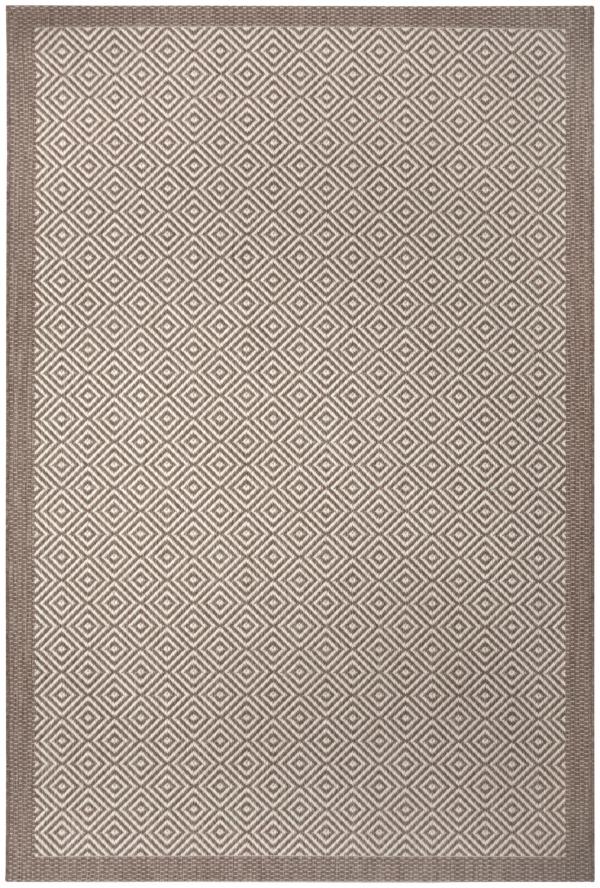 Moderan tepih ravnog tkanja u dijamantskom dizajnu. Može se koristiti i unutra i spolja. Prerađena vlakna polipropilena su posebno izdržljiva i otporna na UV zračenje i vlagu. Takođe pogodno za prostorije sa podnim grejanjem. Uputstvo za njegu: Za čišćenje, tepih se može obrisati vlažnom krpom ili sunđerom. Takođe se može oprati parnim mlaznjakom.
