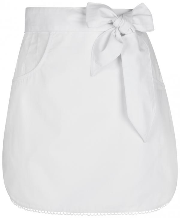 Kratka bijela kecelja sa razigranim heklanim rubom, dva bočna džepa i širokim trakama.