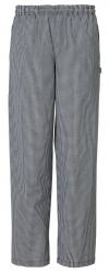 Prugaste muške kuvarske pantalone sa elastičnim pojasom, 2 bočna džepa i 1 zadnji džep.