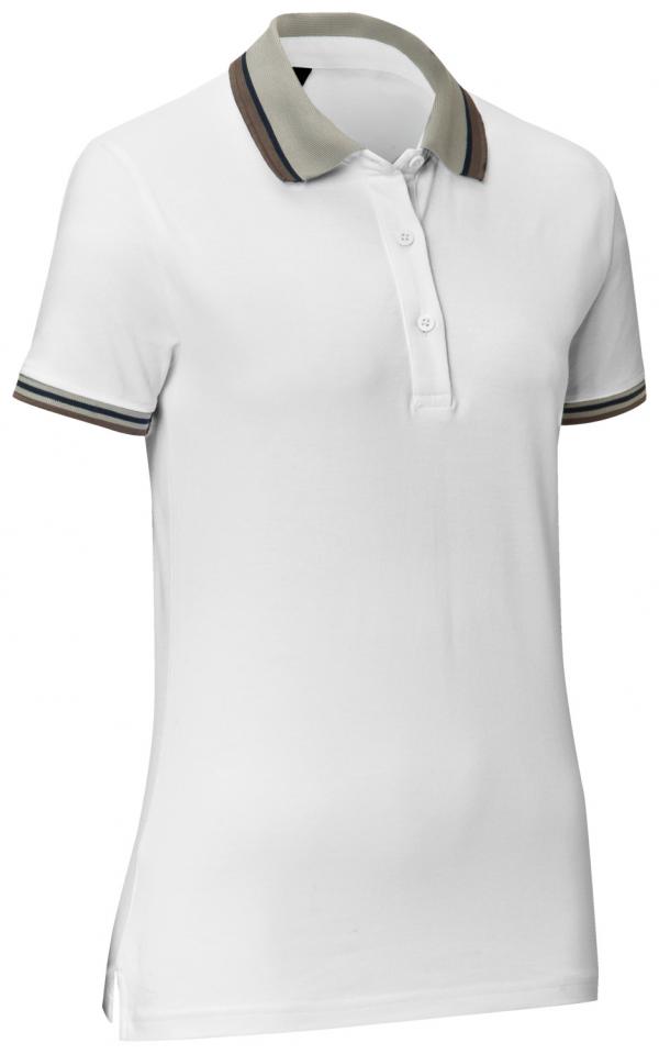 Sportska polo majica kratkih rukava za žene od kvalitetnog pamuka/spandeksa koji se lako održava, otporna na gužvanje. Prugaste aplikacije na ravnim pletenim manžetnama i kragni. Sa preklopom sa četiri dugmeta i kratkim bočnim prorezima. Blago suženi rez.