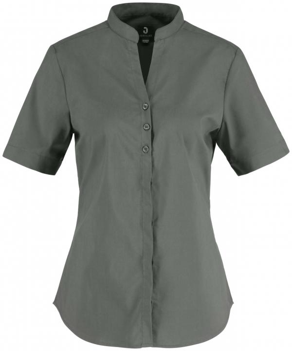 67% cotton, 33% polyester. 30°C wash. Simple, short-sleeved women`s blouse with visible button placket and short stand-up collar. With short bust darts and waist seams at the back for a perfect fit. Extra-long back and rounded hem. Particularly easy-care and easy-iron thanks to the polyester content. Regular fit. Back length: 68 cm for size 36.