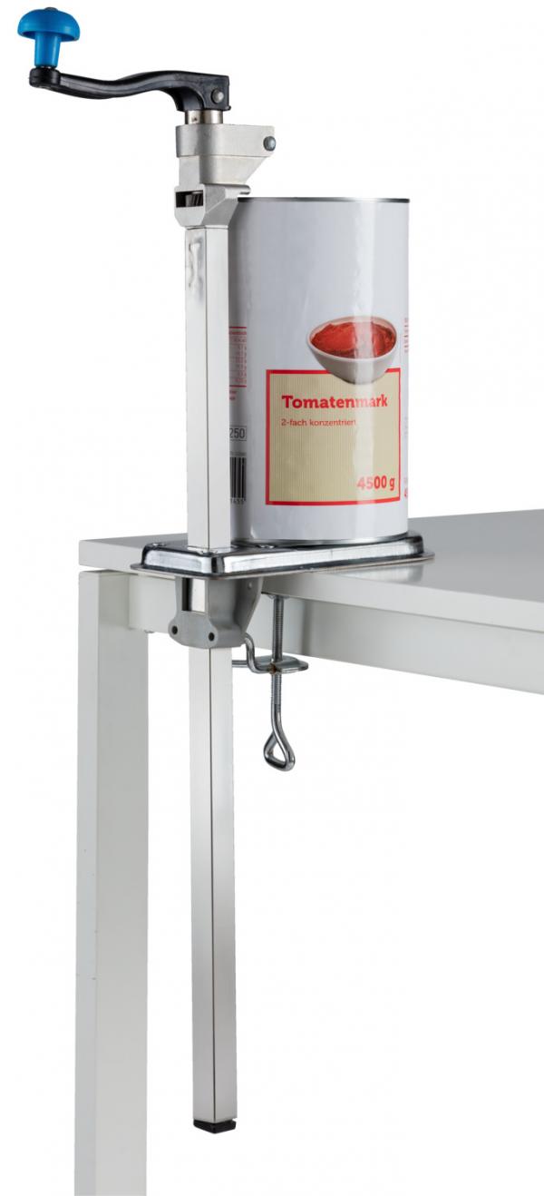 Robustan otvarač za konzerve napravljen od nehrđajućeg čelika. Za montažu na vrhovima stolova. Za konzerve sa max. visinom od 55 cm. Veoma robusna i dugotrajna. Dimenzije osnovne ploče WxL 11x25 cm, dužina šipke 60cm. Maksimalna moguća debljina stola iznad 7 cm.