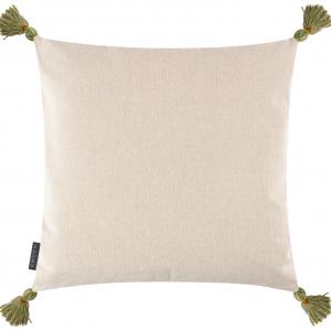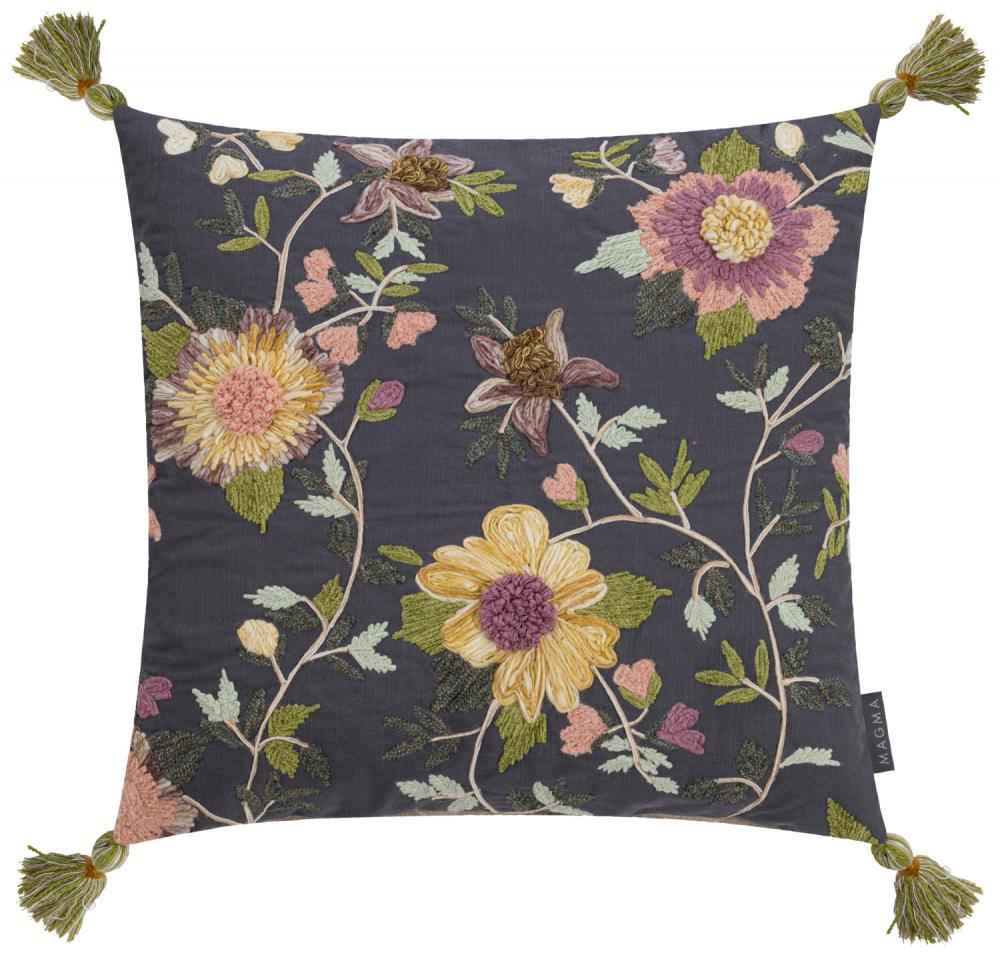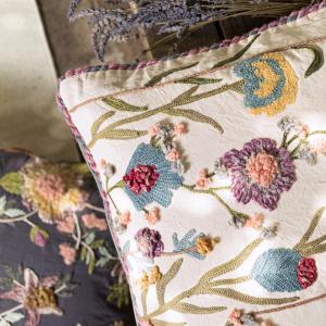 Jastučnica sa detaljnim cvjetnim vezom na prednjoj strani i kremom nazad. Sa malim rešetkama u uglovima. Praktičan zatvarač za jednostavno uklanjanje i pokrivanje. Isporučuje se bez punjenja. 90% pamuk, 5% poliester, 5% poliakril. Pranje ruku. 494 g/m.