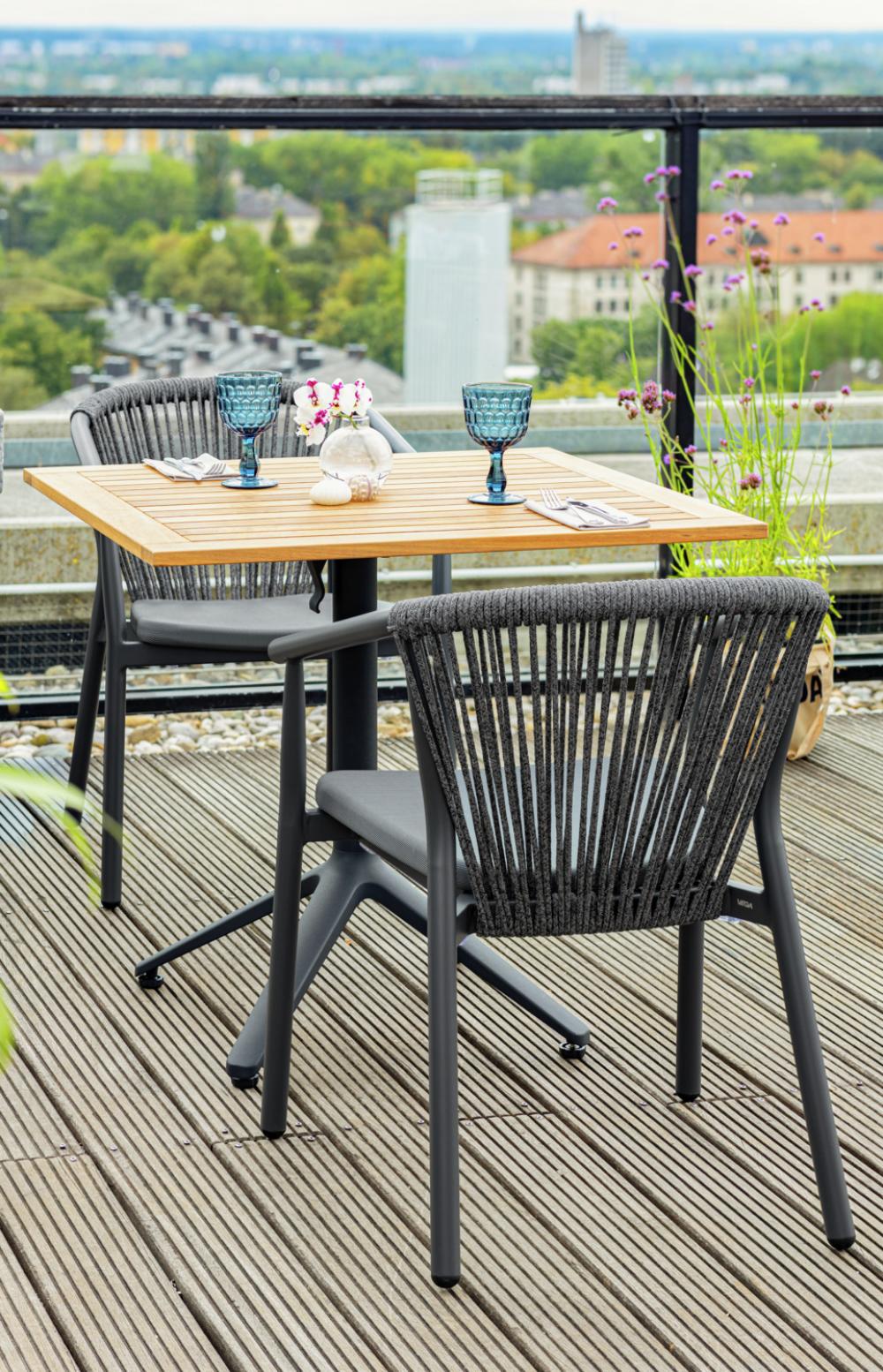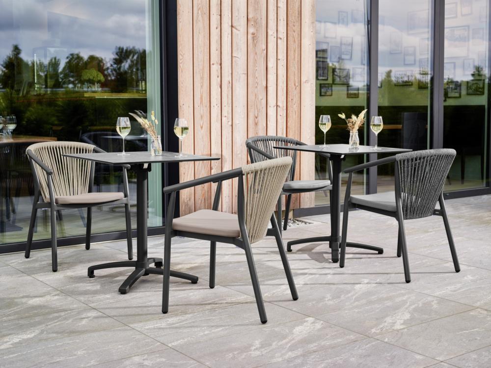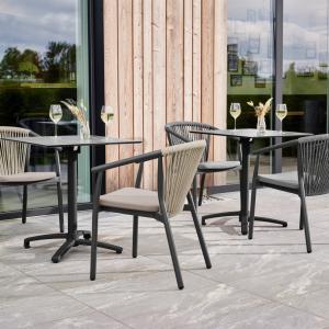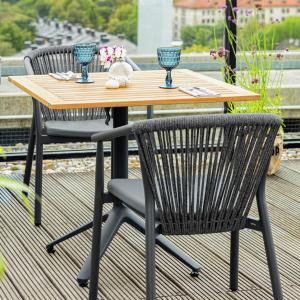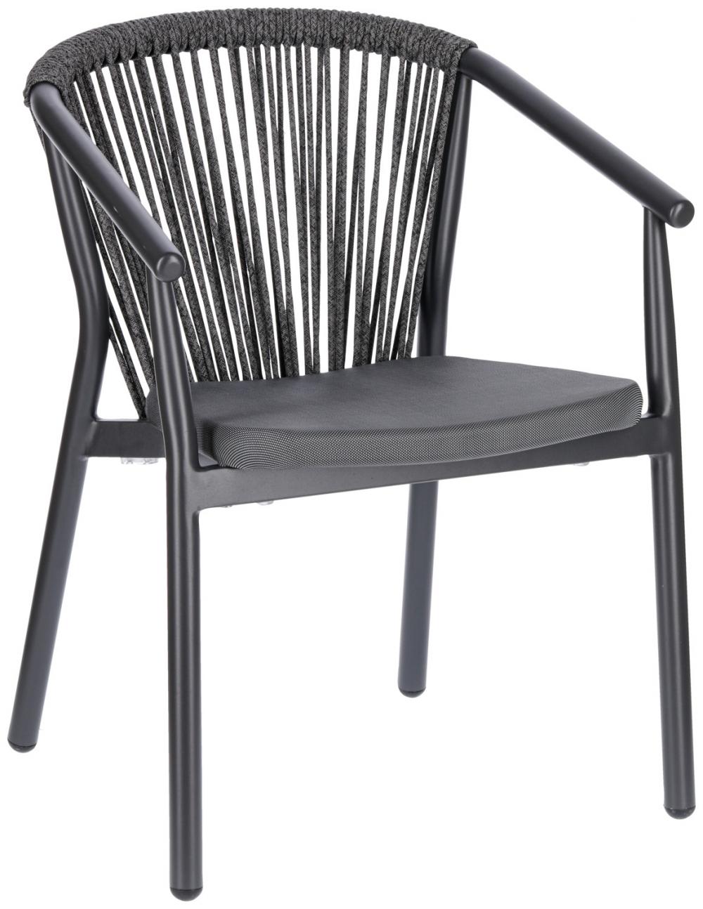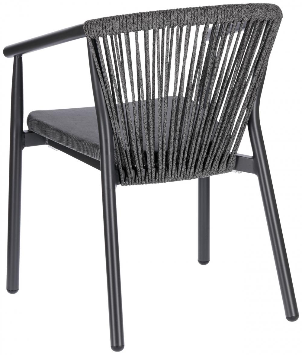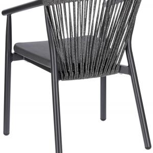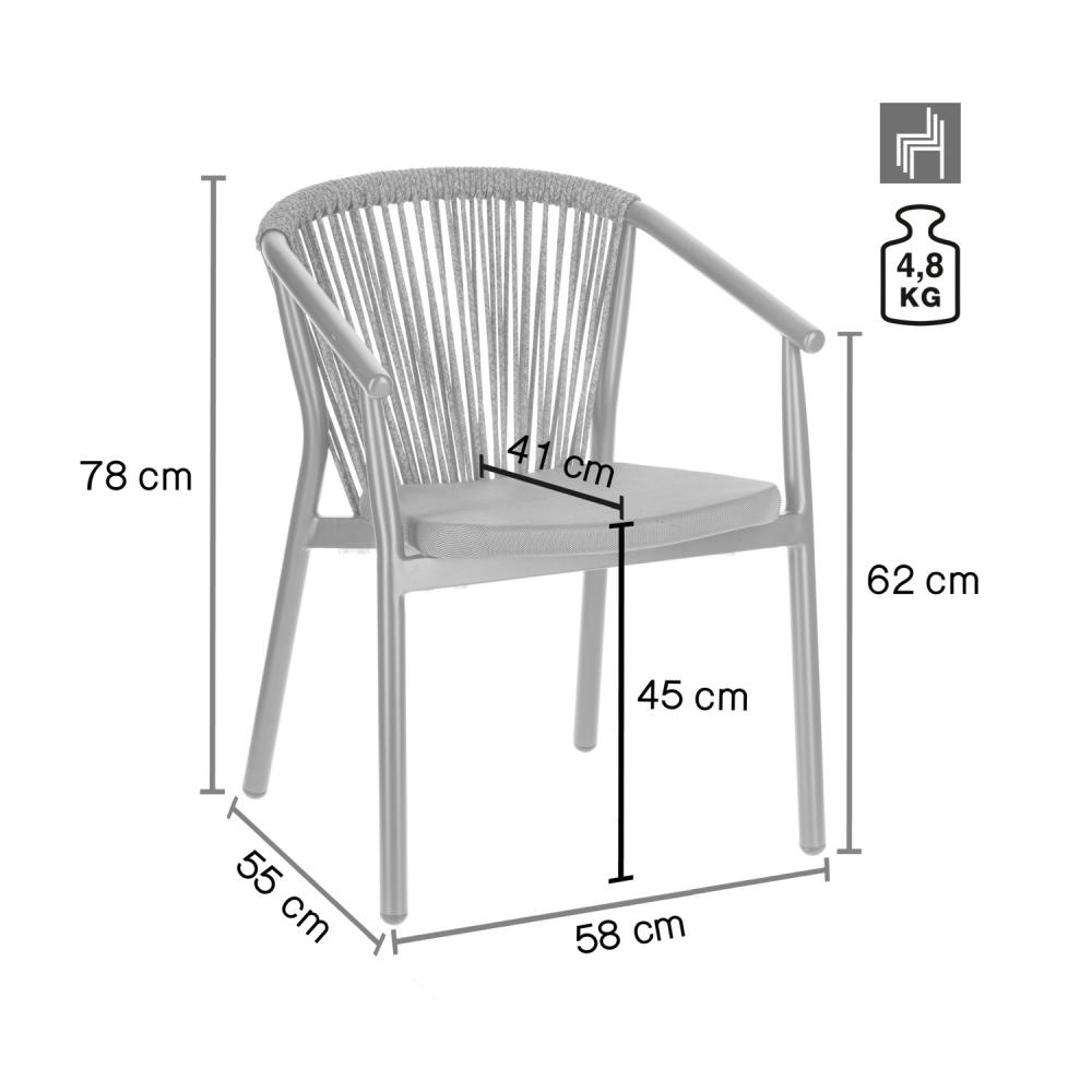 Visokokvalitetna vanjska stolica od aluminijumskog okvira obloženog prahom i naslona od pletenog užeta (98% polipropilen + 2% poliestersko predivo). Sedište od tekstilne presvlake. Otporan na vremenske uslove, UV otporan i može se slagati. Pogodno za spoljašnju upotrebu. Plastični klizači uključeni. Isporučuje se sastavljeno.