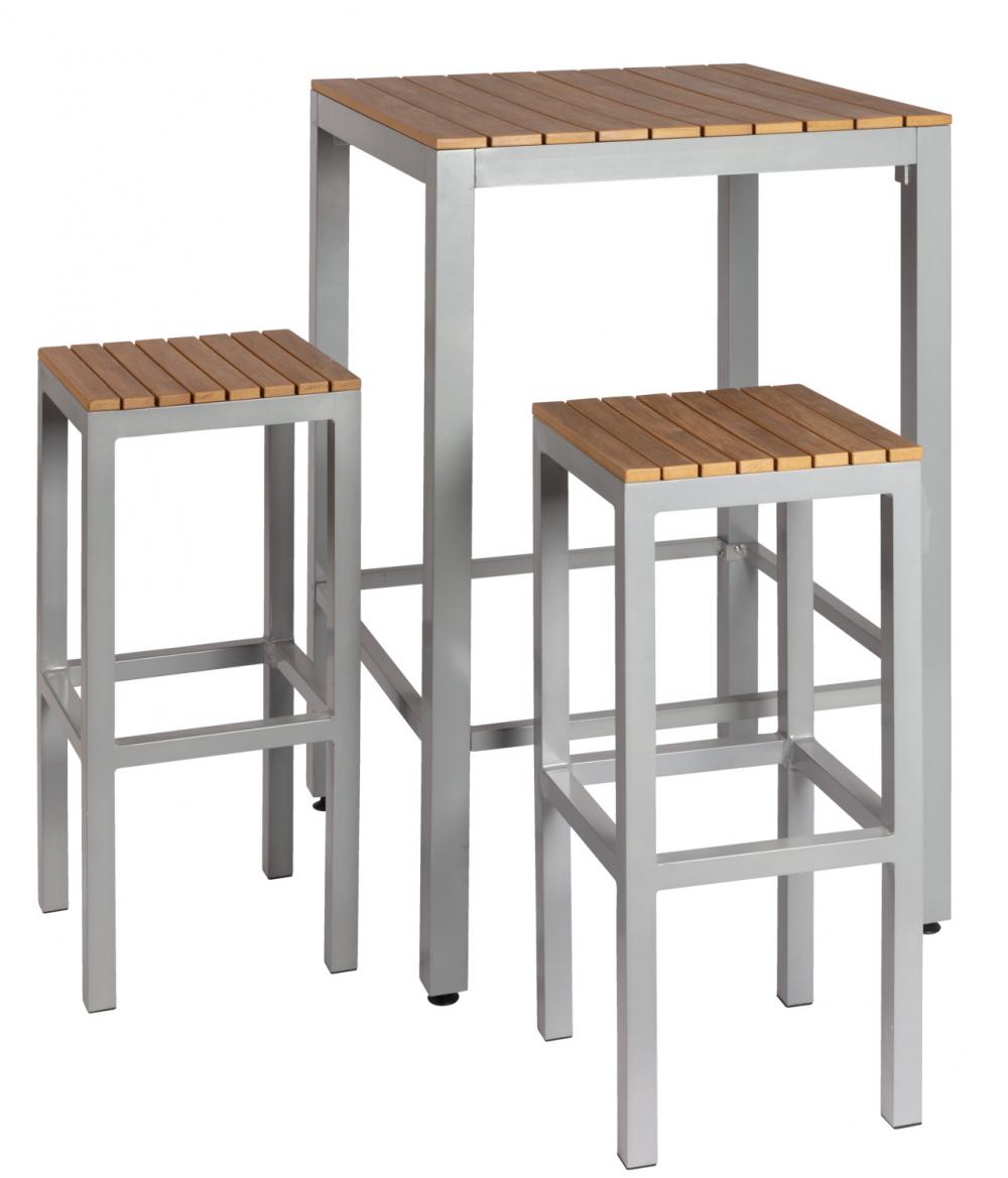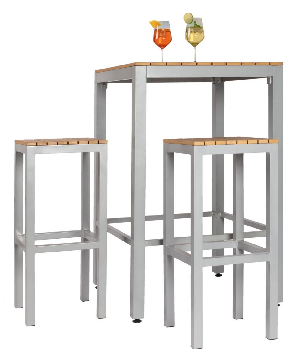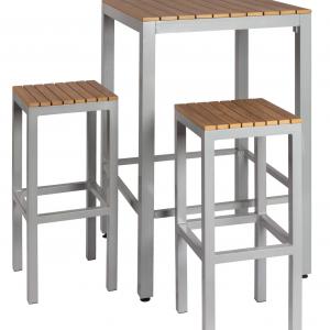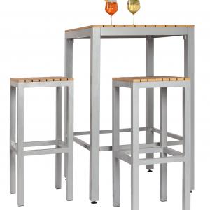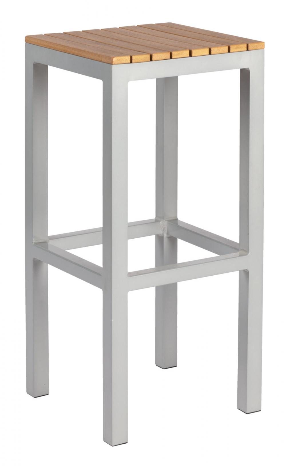 Jednostavna barska stolica napravljena od laganog aluminijuma obloženog prahom (Ã ̃ okvir: 3 cm, debljina materijala 1,5 cm). Sedište napravljeno od plastičnih rešetki debljine 1,5 cm u izgledu tikovine. Praktična krst se šepuri kao naslon za stopala. Sa plastičnim podnim klizištima. Pogodno za unutrašnju i spoljašnju upotrebu. Kompletno sastavljen.