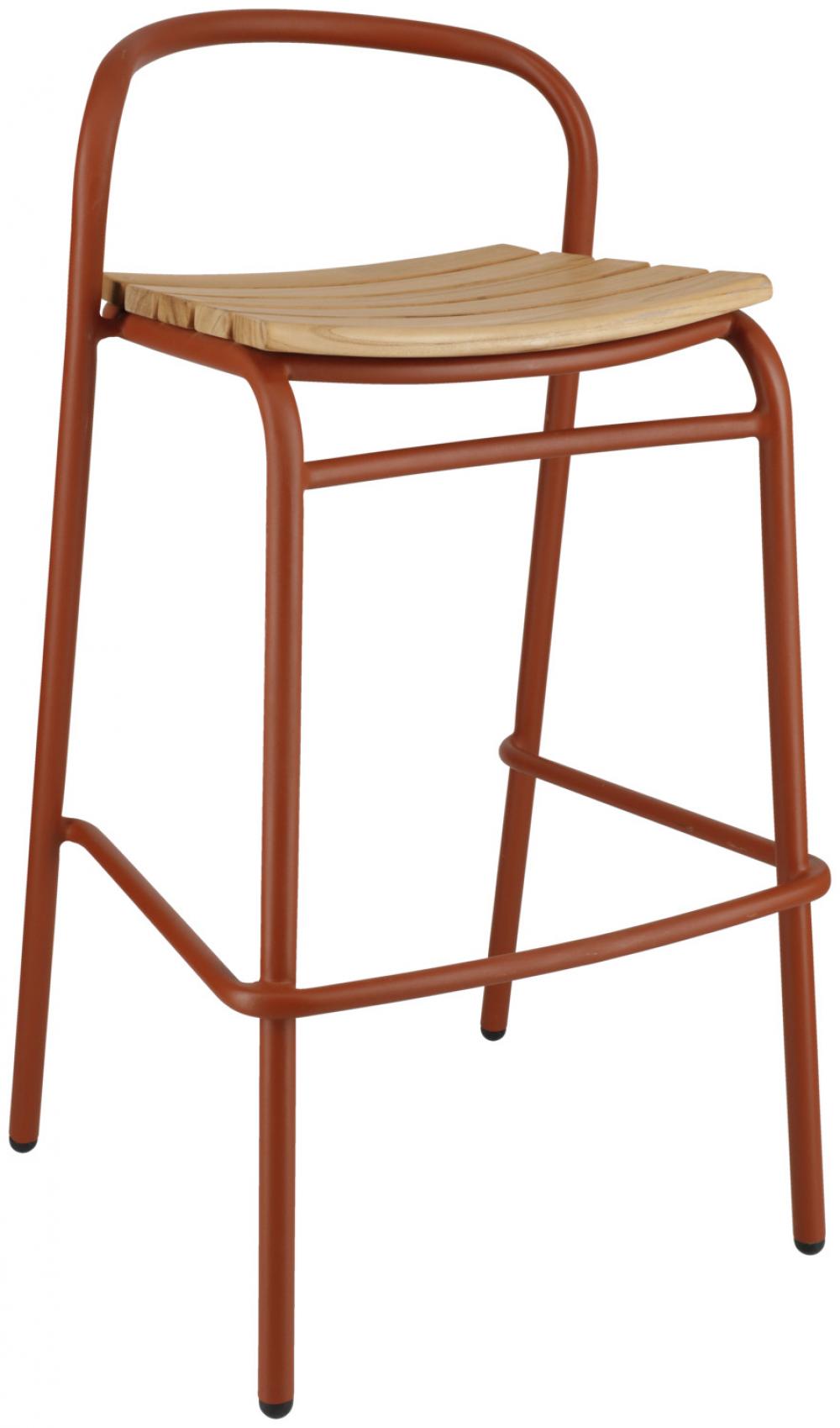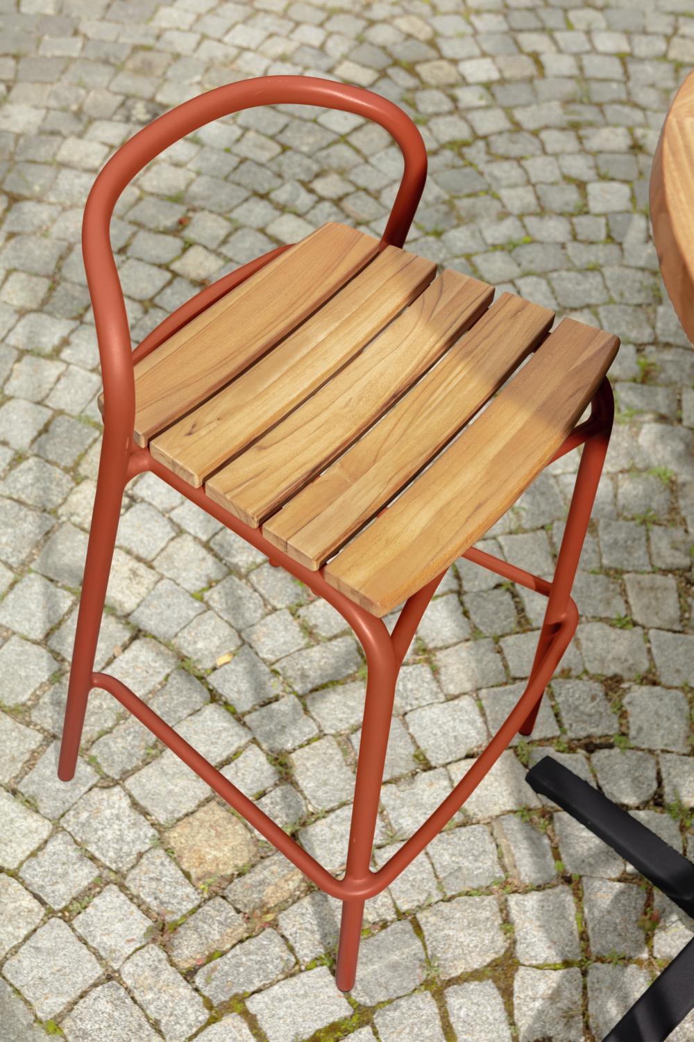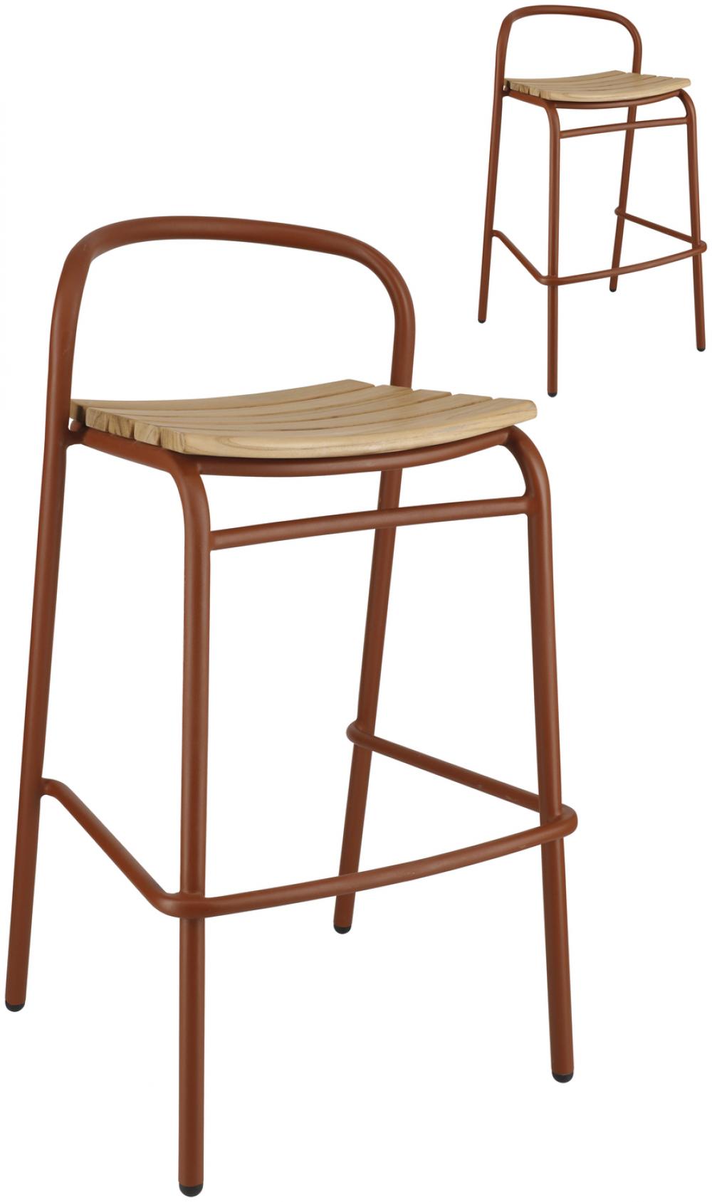 Ova visokokvalitetna barska stolica za vanjsku upotrebu, namijenjena ugostiteljstvu, kombinuje moderan, čvrst aluminijski okvir s elegantnim tikovim letvicama na sjedištu i naslonu.