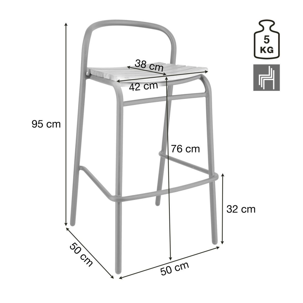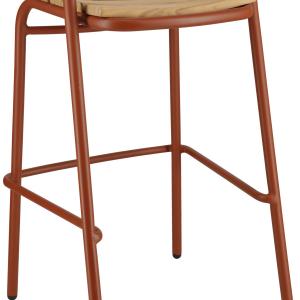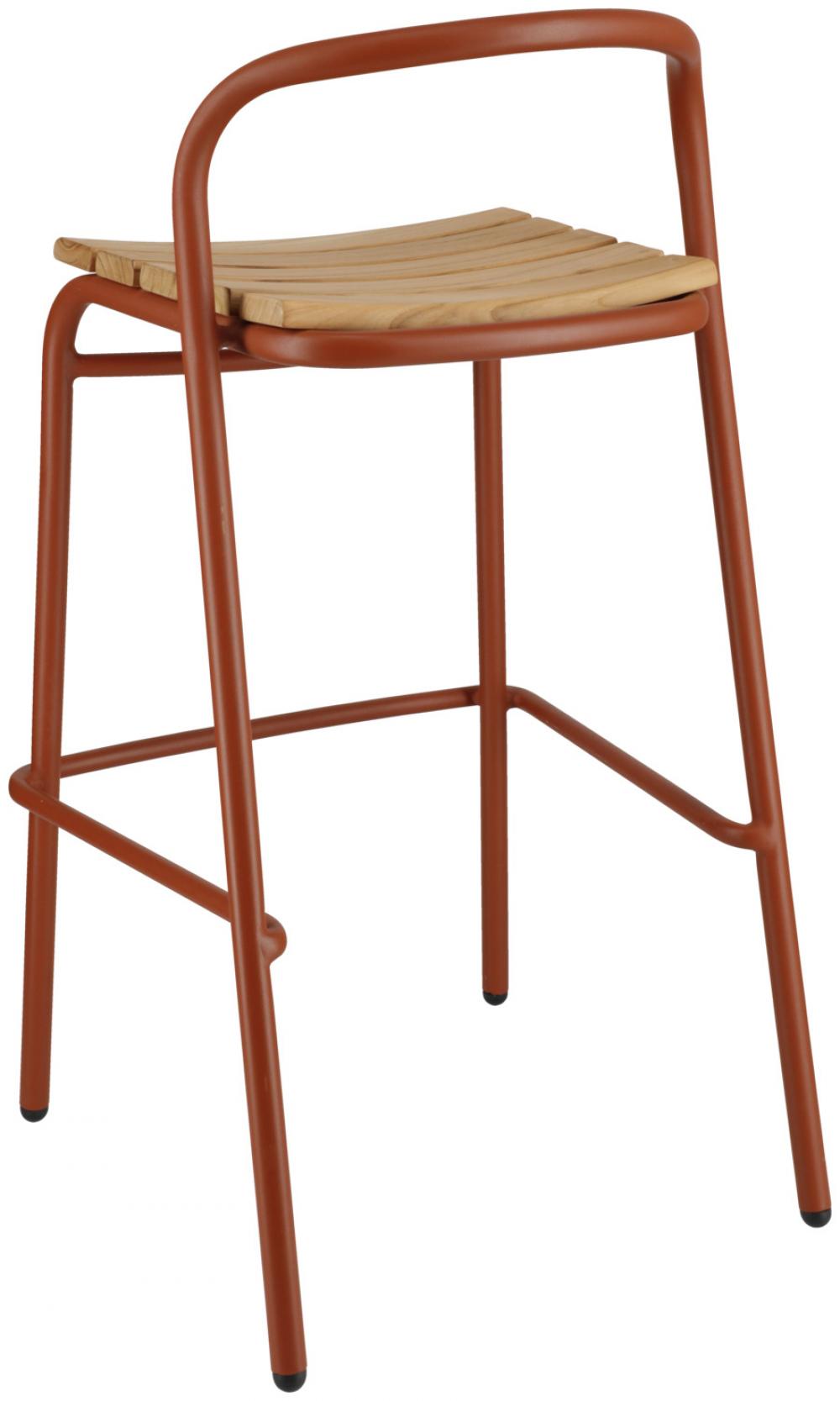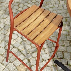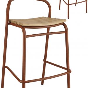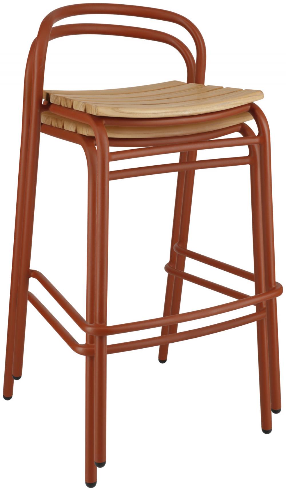 Ova visokokvalitetna barska stolica za vanjsku upotrebu, namijenjena ugostiteljstvu, kombinuje moderan, čvrst aluminijski okvir s elegantnim tikovim letvicama na sjedištu i naslonu.
