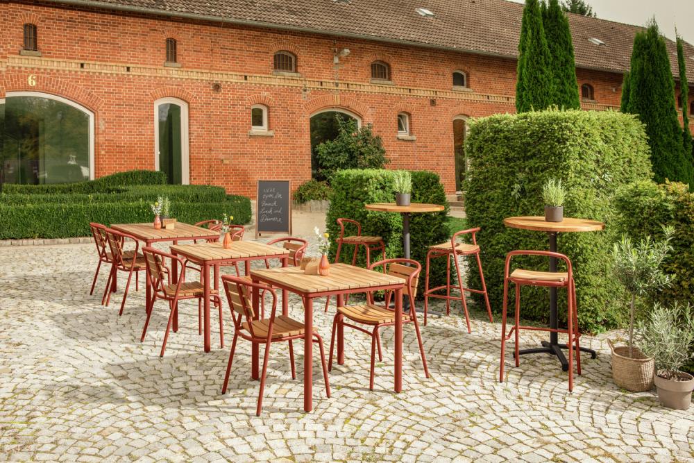 Tikove letvice izrađene su od visokokvalitetne, netretirane tikovine, poznate po izuzetnoj otpornosti na vremenske uvjete – savršeno za svakodnevnu upotrebu u vanjskim ugostiteljskim prostorima. Preporučuje se da tikovina prirodno odstoji na vremenu; nakon nekog vremena pojavljuje se tipična elegantna srebrnosiva patina koja daje karakter namještaju od tikovine. Za redovno čišćenje dovoljne su topla voda i mekana četka – brzo, higijenski i jednostavno u svakodnevnom radu.