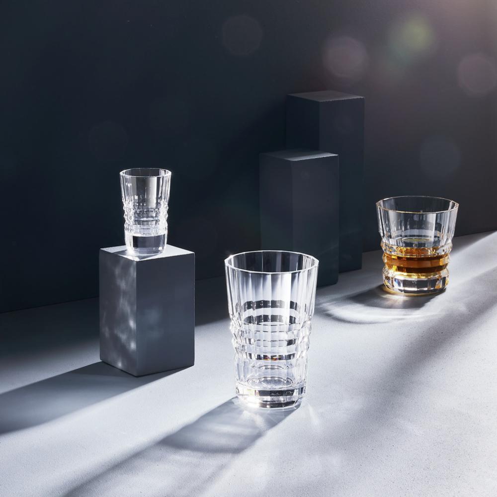 Kristalna šot čašica oduševljava svojom visokom transparentnošću i čistim dizajnom, kojim dominira vertikalni reljefni uzorak. Tri horizontalna reljefna stepena blago prelamaju svjetlost i stvaraju upečatljiv trodimenzionalni (3D) efekat, dajući svakom piću elegantan, gotovo skulpturalan izgled.