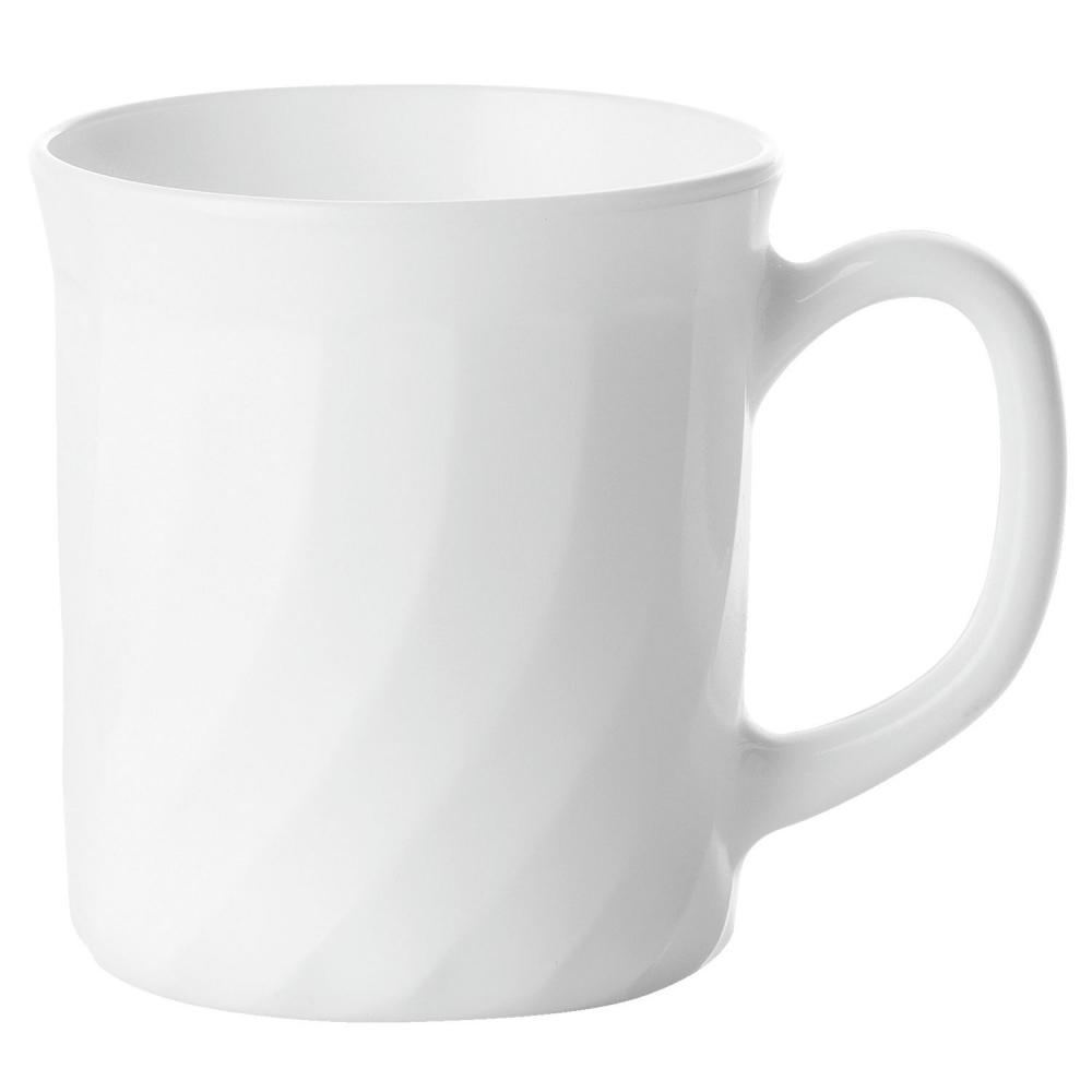 Klasična bijela šolja napravljena od kaljenog opalnog stakla, posebno čvrsta i otporna na udarce. Može se prati u mašini za suđe i može se koristiti u mikrotalasnoj pećnici.
