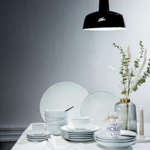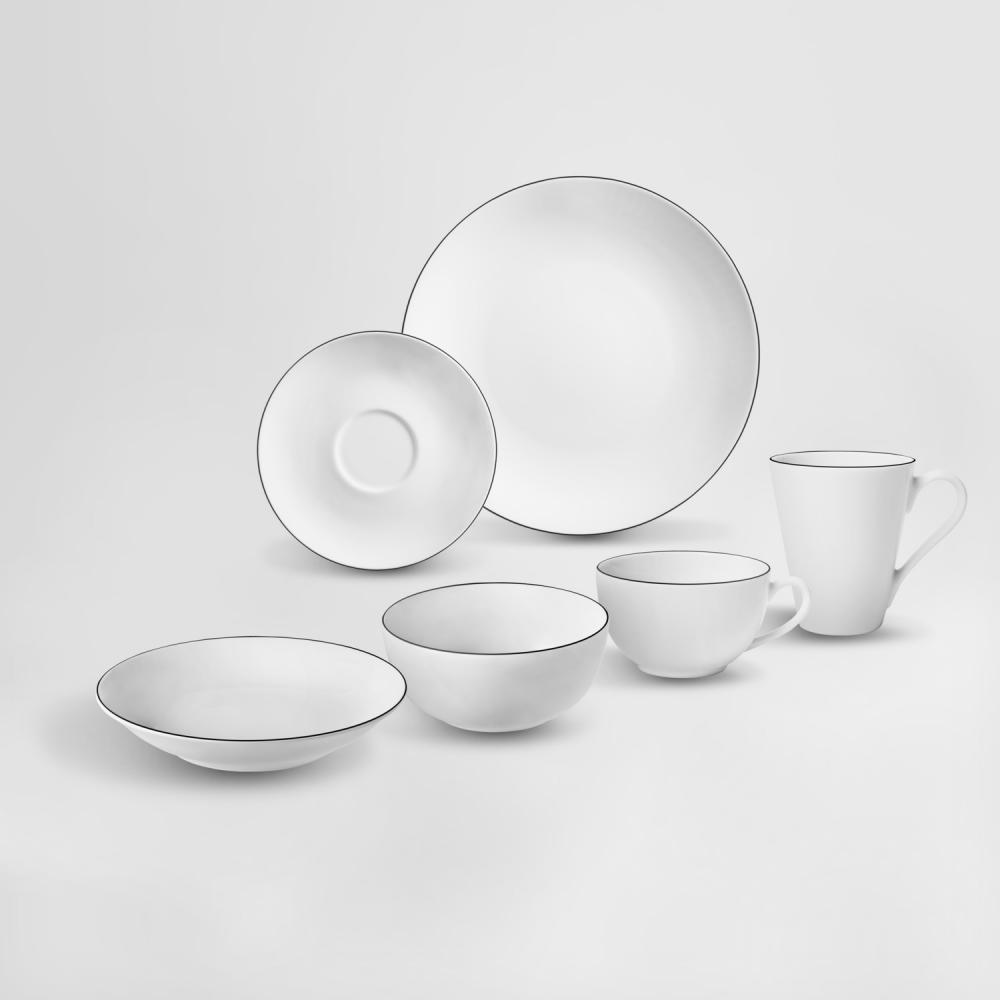 Atraktivna serija od bijelog porcelana sa ukrasnim crnim rubom.Materijal: porcelan. Može se prati u mašini za suđe i može se koristiti u mikrotalasnoj pećnici.