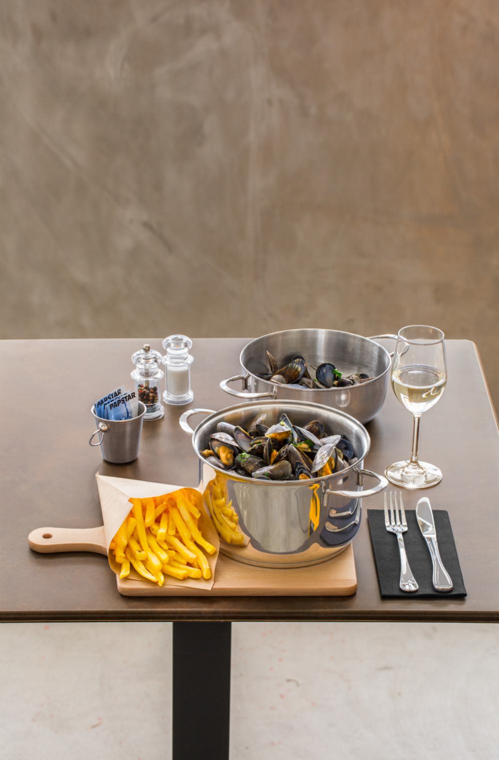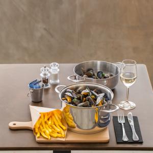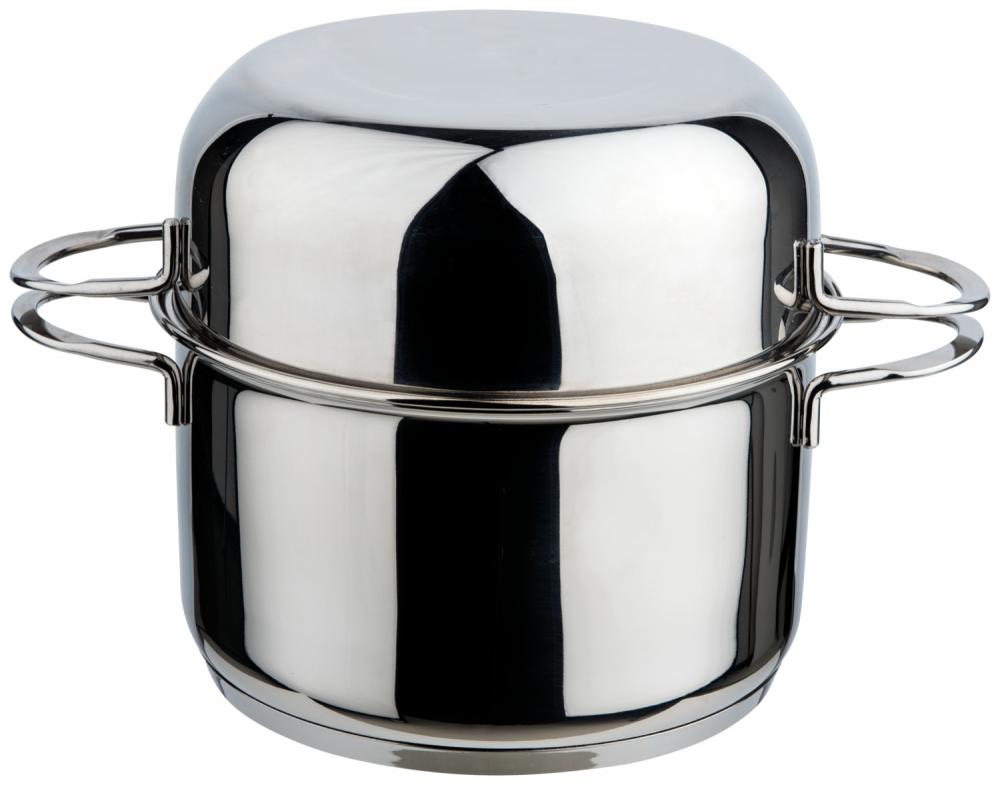 Ovaj lonac za dagnje održava dagnje toplim do serviranja. Praktično: Poklopac se može koristiti i kao poslužavnik za stolom. Izrađen od hrom-nikl nerđajućeg čelika 18/10. Pogodno za sve vrste ploča za kuvanje (osim indukcionih). Može se prati u mašini za suđe .