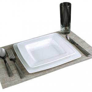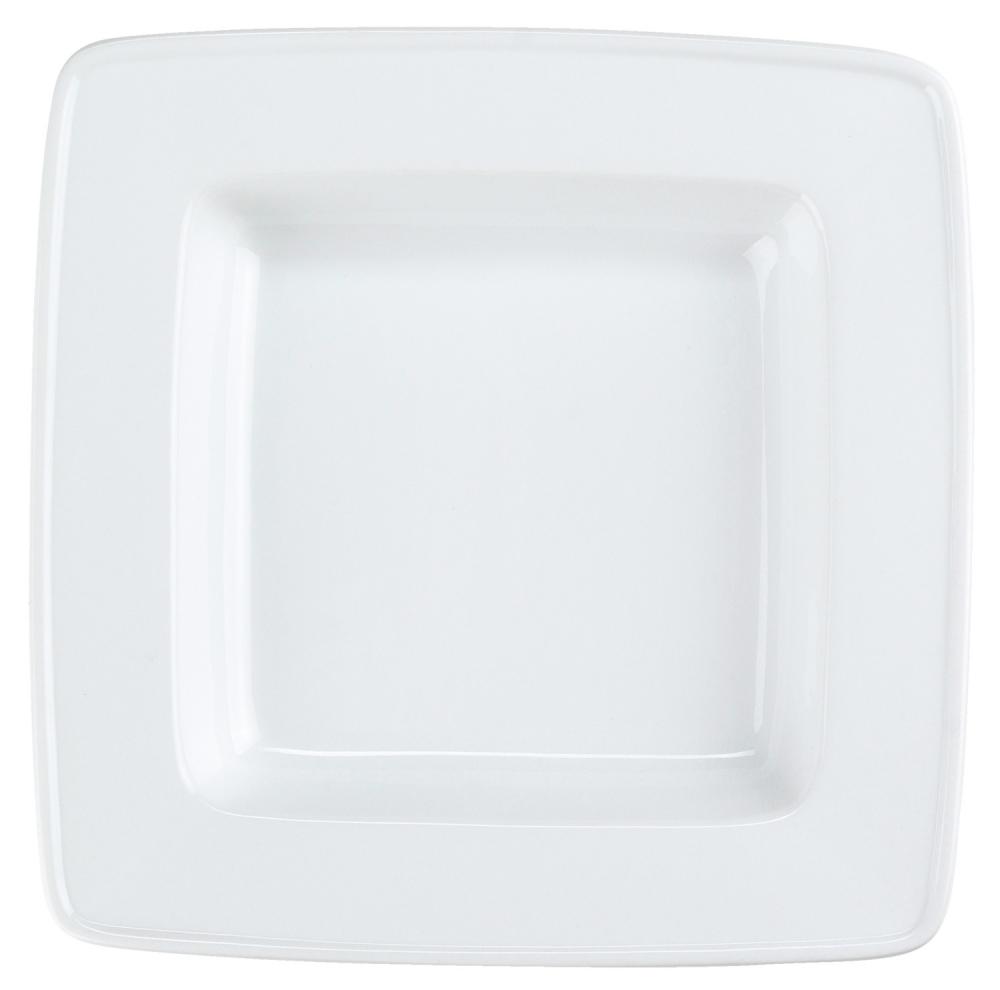 Elegantno posuđe od bijelog hotelskog porcelana, modernog kvadratnog oblika. Posebno stabilan zbog ekstra čvrste glazure. Sa glatkim rubom. Može se prati u mašini za suđe i može se koristiti u mikrotalasnoj pećnici.