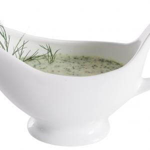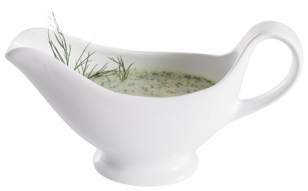 Klasična posuda za sos od bijelog porcelana. Može se prati u mašini za suđe i može se koristiti u mikrotalasnoj pećnici.