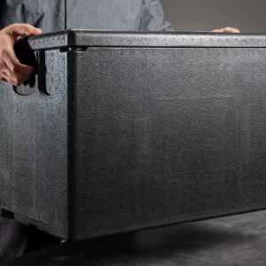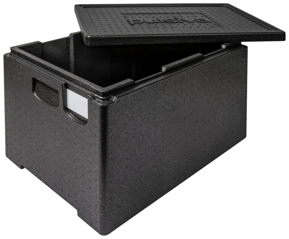 Robust and durable insulated box with fixed lid made of black EPP plastic (material thickness: 3 cm). Suitable for transporting, insulating, cooling and keeping food warm. With smooth, watertight inner surface. The insulating properties range from - 40 °C to + 120 °C, maximum temperature loss when the box is closed is 2-3 °C per hour. Particularly unbreakable, hygienic, food-safe and lightweight. Environmentally friendly, as 100% recyclable and CFC-free. Stackable with and without lid. Handy handles on the sides and grip strips at the bottom. This box also has 4 recessed grips on the inside to make loading and unloading easier. There is a slot for label cards on both narrow sides. Dishwasher-safe. Supplied without GN containers. Order matching accessories such as cooling top, GN container or trolley at the same time.