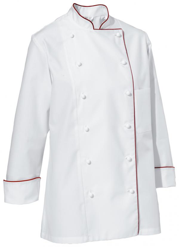 Moderna, izdržljiva ženska kuvarska jakna sa dugim rukavima od pamuka koji se lako održava. Sa dvorednim zatvaranjem sa 6 dugmadi, duplim preklopom za dugmad i dugmadima koji se mogu ukloniti. Na kragni i ivici zatvarača se nalaze cijevi kontrastne boje. Klasična ženska kuvarska jakna ima džep na prsima. Dugi rukavi, sa cijevima na porubu, mogu se praktično preklopiti. Takođe dostupan u polu rukavima. Pravi rez sa maksimalnom slobodom kretanja.