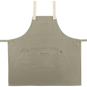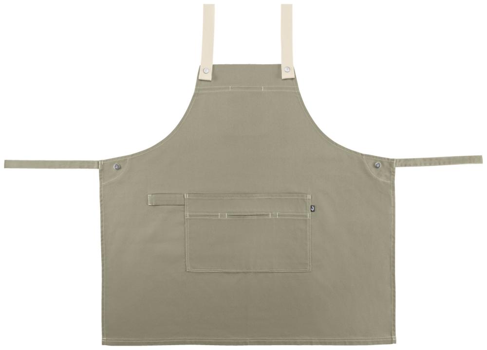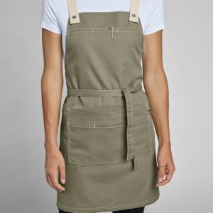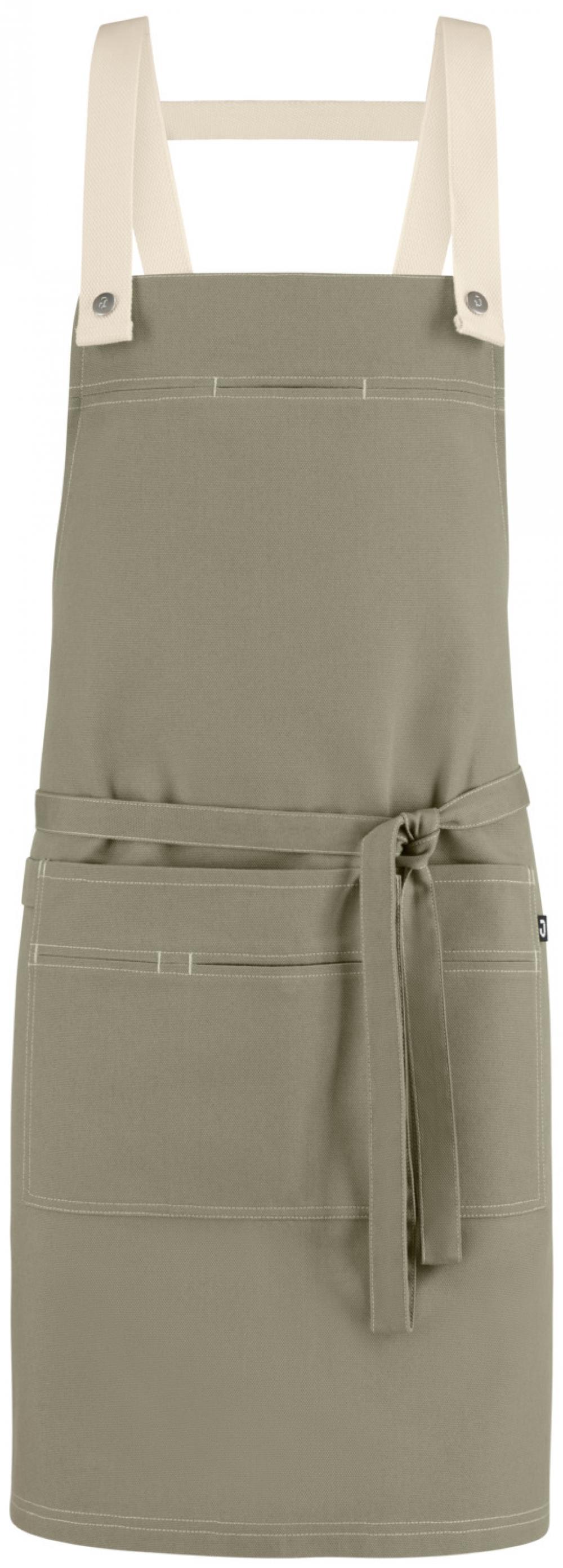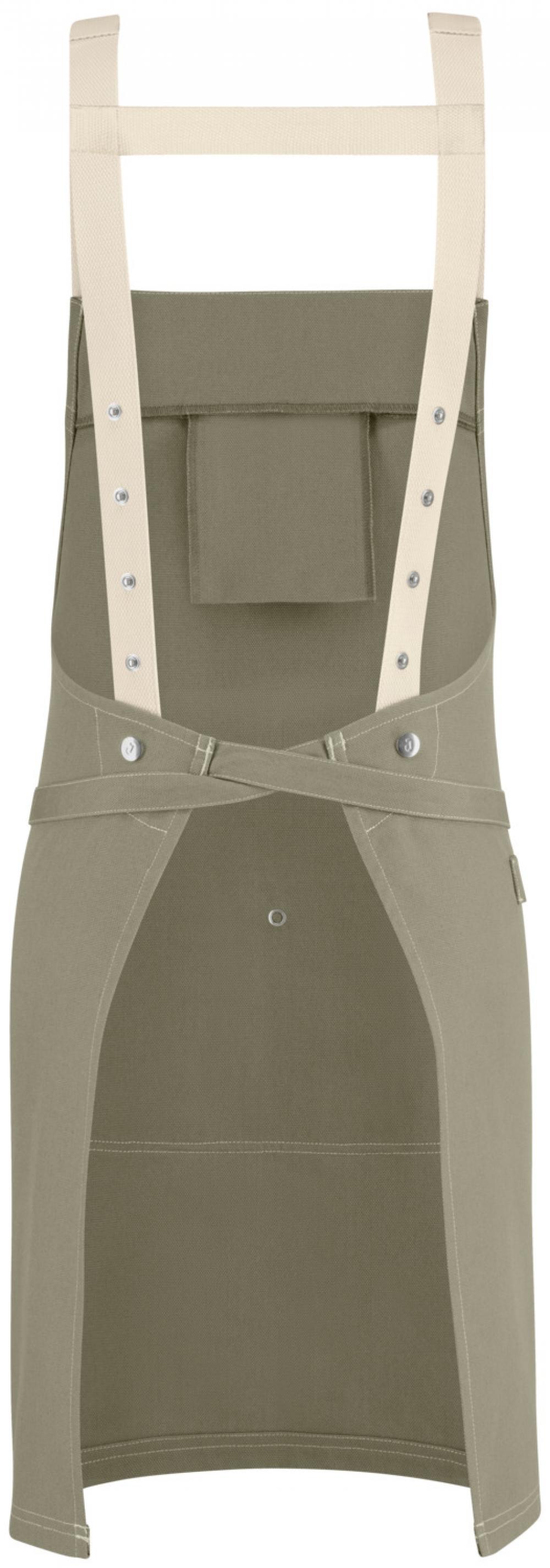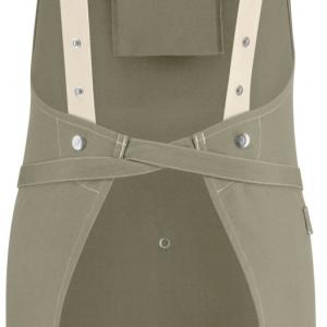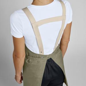 Moderna kecelja s naprsnikom izrađena od lagane canvas (platnene) mješavine, s kontrastnim ukrasnim šavovima.