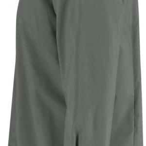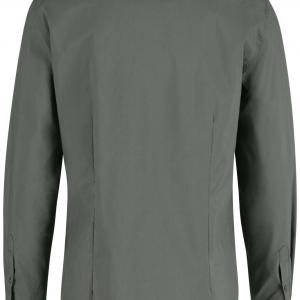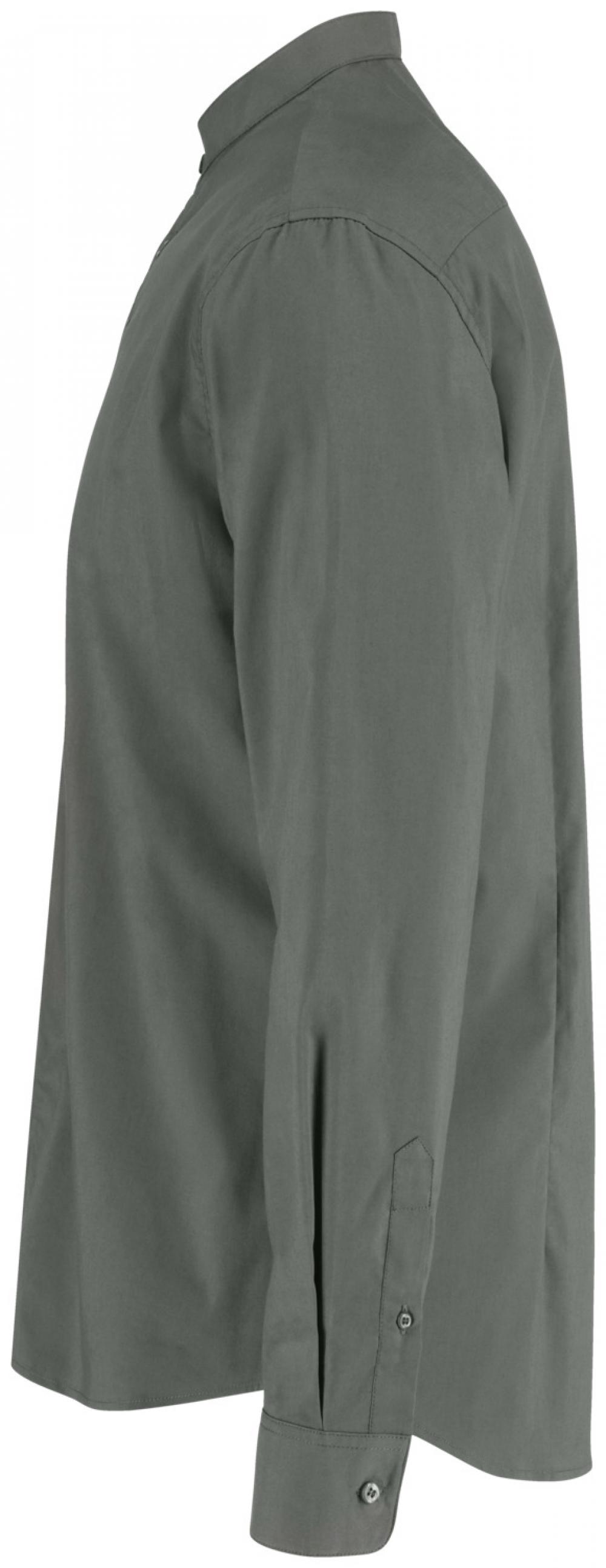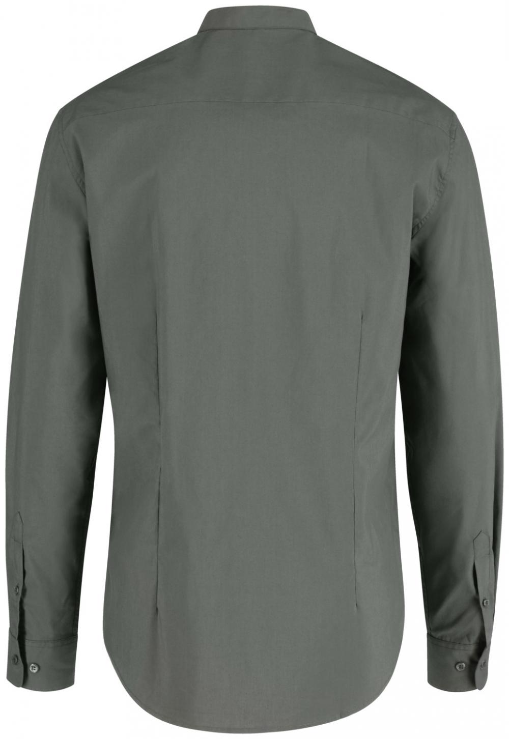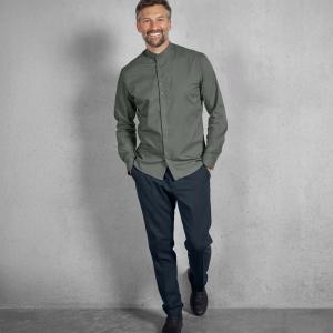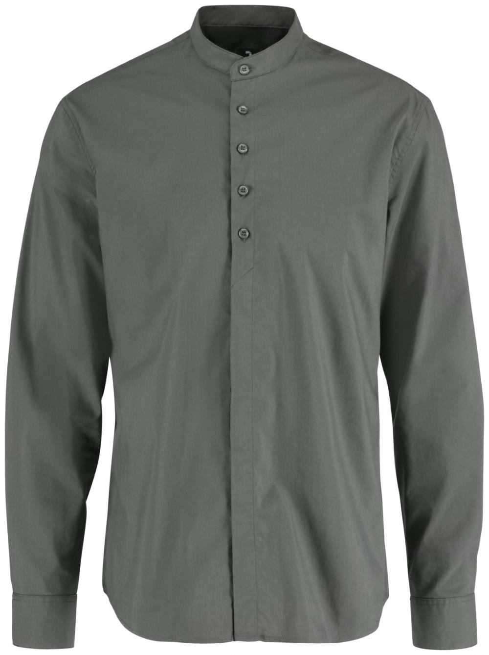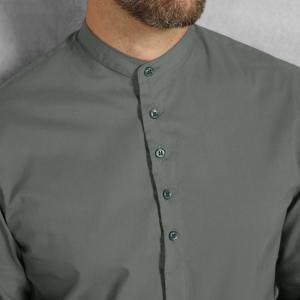 Jednostavna muška košulja dugih rukava s vidljivom dugmetom, kratkim stojećim ovratnikom i manžetama na rukavima.